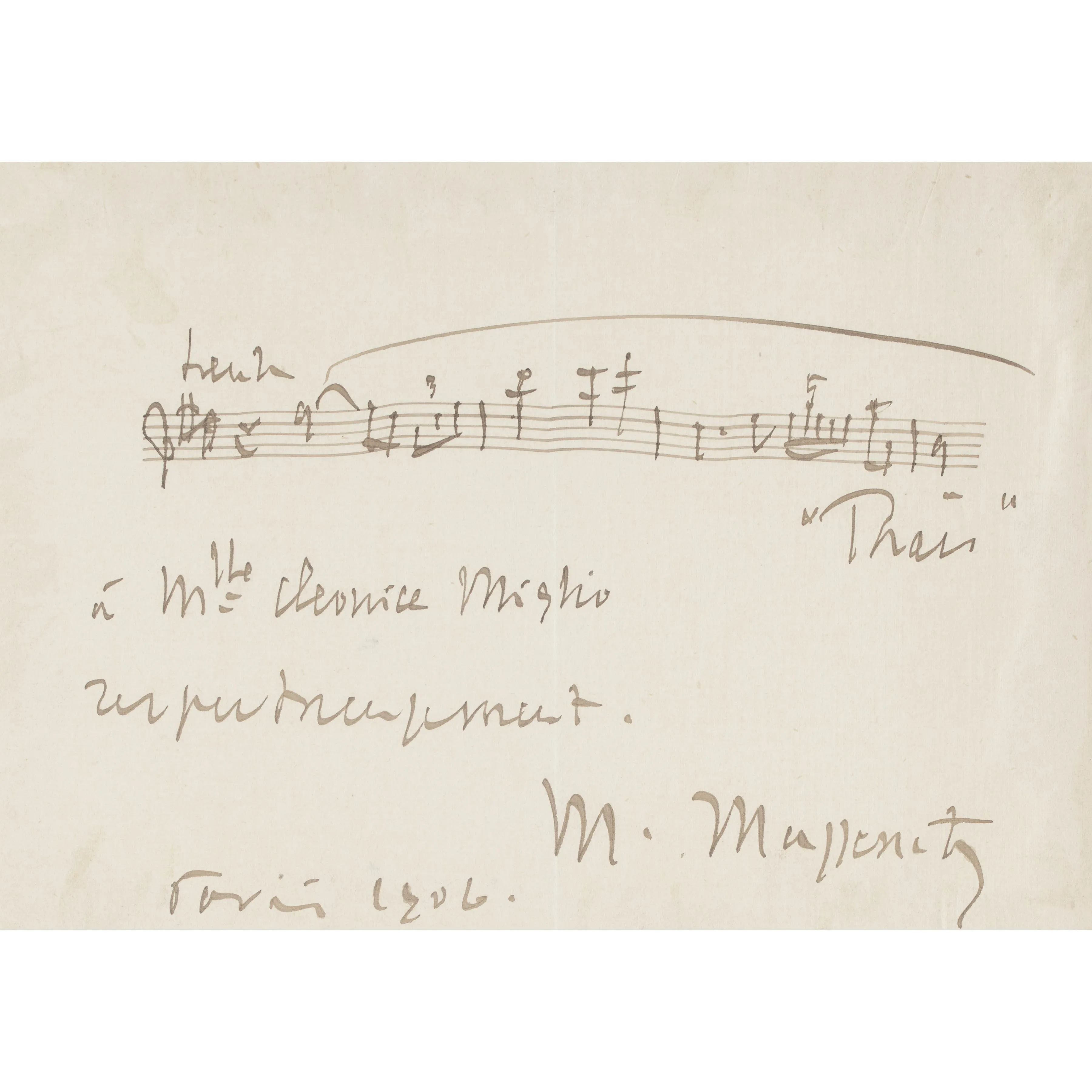 Massenet, Jules. Dedica e citazione autografa dalla Thais datata ‘Paris 1906’.