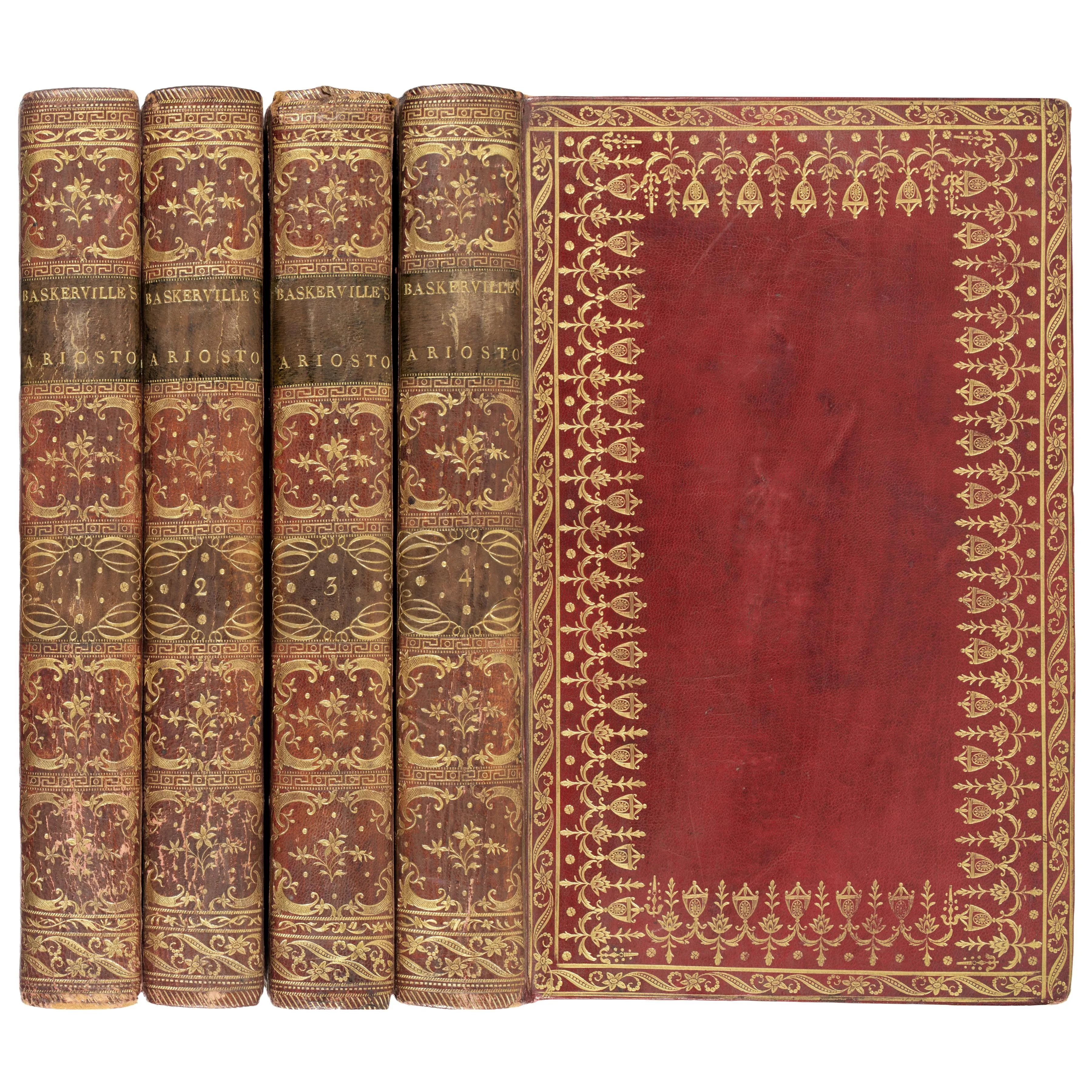 4 volumi in ottavo (235 x 145 mm); [6], LVIII, 362, [2]; [2], 450, [2]; [2] 446, [2]; [2], 446, [2] pagine. Antiporta col ritratto di Ariosto disegnato da Eisen, 46 tavole a piena pagina da originali di Cipriani, Cochin, Eisen, Monnet, Moreau finemente incise in rame da Bartolozzi, Choffard, Duclos, Moreau ed altri (manca l'elenco degli associati, lieve ed uniforme ossidazioni e bruniture.) Legature coeve in marocchino rosso, piatti con ampia cornice dorata di filetti e rotelle fitomorfe, dorsi con tasselli verdi per il titolo e la numerazione dei volumi, merletti dorati interni, tagli dorati (rovinata la cuffia del terzo volume). Ex libris Cremorne.