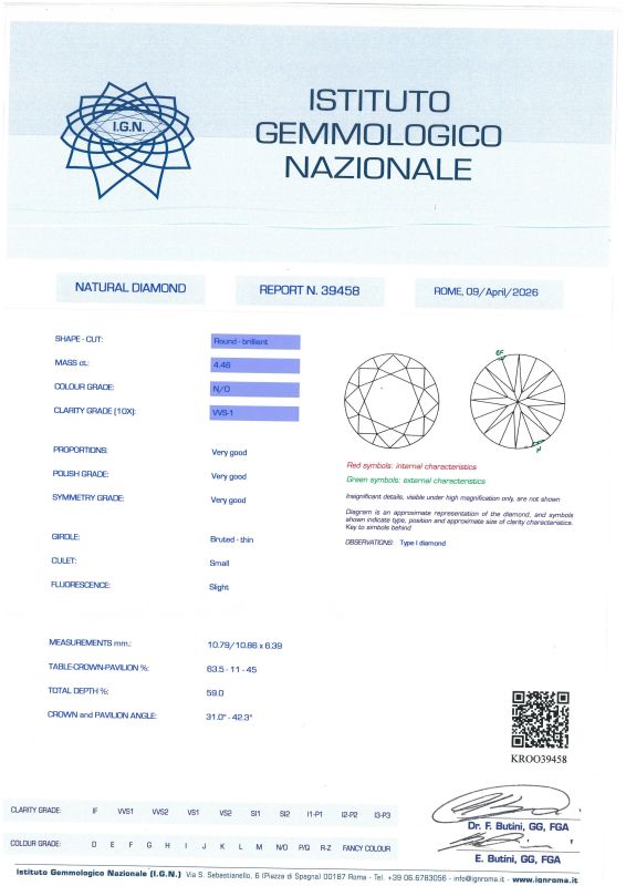 in oro bianco 18kt, impreziosito da un diamante taglio brillante di ct 4.46, colore N/O, purezza Vvs1, mis. 17/57, gr. 14. Corredato di certificato IGN del 09/04/2026 attestante le caratteristiche della pietra.