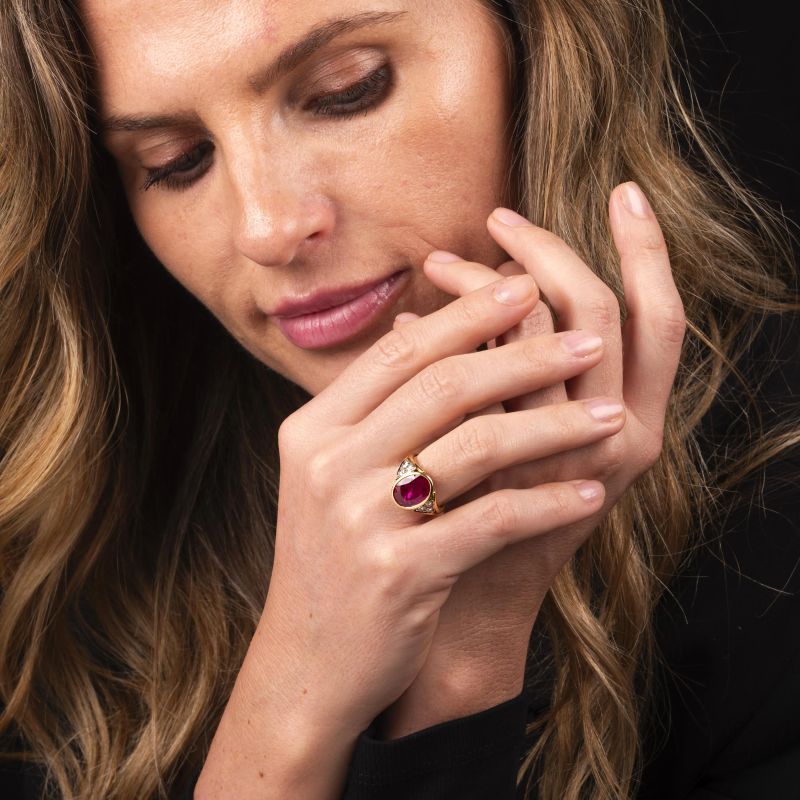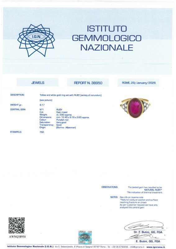 in oro giallo 18kt, impreziosito al centro da un rubino birmano taglio ovale per ct 3.60 circa, affiancato da diamanti taglio brillante per ct 0.30 circa, mis.13/53, gr. 8. Corredato di certificato IGN del 29/01/2026 attestante l'origine geografica della pietra e l'assenza di trattamenti termici.