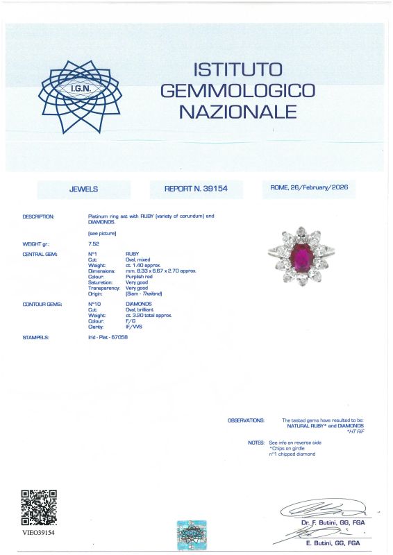 in platino, impreziosito al centro da un rubino taglio ovale di ct 1.40 circa, circondato da diamanti taglio navette per ct 3.20, punzone del platino, mis. 10/50, gr. 7. Corredato di certificato IGN del 26/02/2026 attestante le caratteristiche della pietra.
