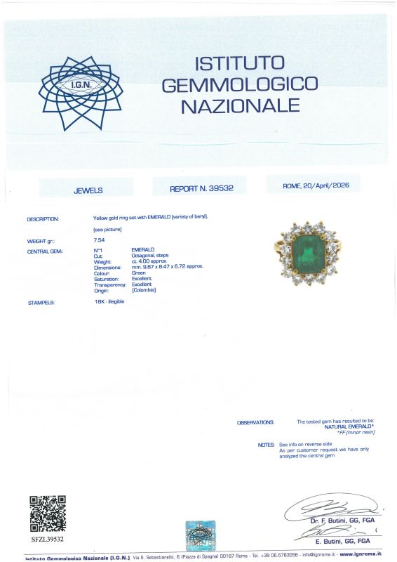 in oro giallo 18kt, impreziosito da uno smeraldo colombiano taglio ottagonale di ct 4 circa, circondato da diamanti taglio brillante per ct 1.40 circa, punzone 18kt, mis. 13/53, gr. 7. Corredato di certificato IGN del 20/04/2026 attestante l'origine geografica e le caratteristiche della pietra.