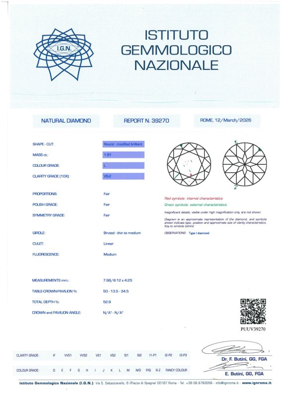 in oro bianco, impreziosito da un diamante taglio brillante di ct 1.81, colore L, purezza Vs2, mis. 18/58, gr. 3. Corredato di certificato IGN del 12/03/2026 attestante le caratteristiche della pietra.