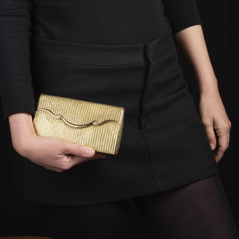 con texture in oro giallo e bianco 18kt, e specchio interno, apertura frontale decorata da fregi, punzone 750 e del fabbricante, dim. cm 16x4x9.5 circa, gr. 386, peso netto gr 365