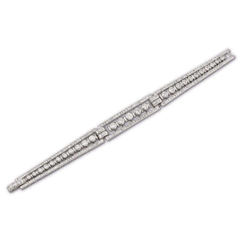 in oro bianco 18kt, composto da segmenti impreziositi da diamanti taglio brillante per ct 6.50 circa, carrè per ct 3.70 circa, e baguette per ct 1.10 circa, chiusura a scomparsa, lungh. cm 20, gr. 52