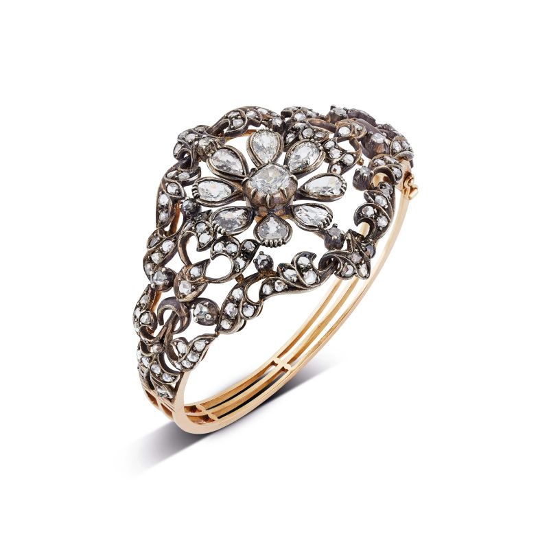 in argento e oro giallo 18kt, impreziosito da diamanti taglio antico e a rosa per ct 5 circa, chiusura a cassetta, diam. cm 6, gr. 28