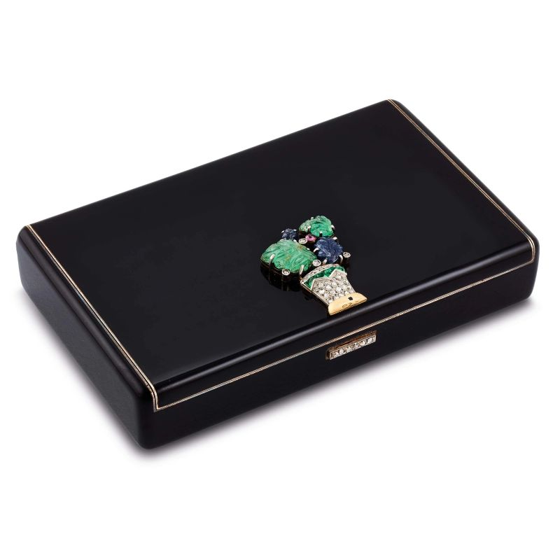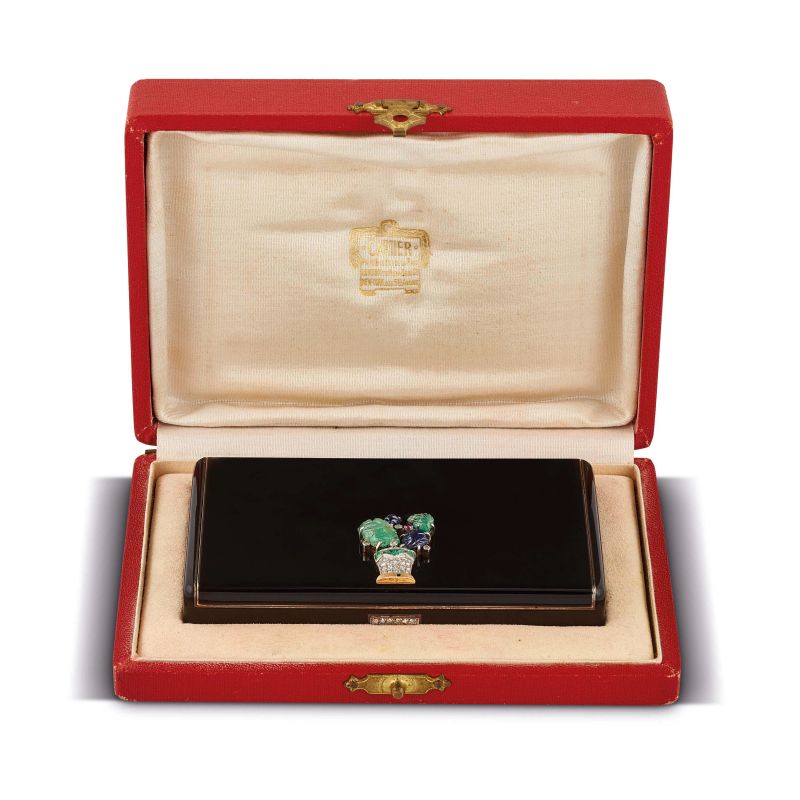 in argento vermeil, laccato in nero, di forma rettangolare, interno con scomparti e portarossetto, decorato da una piccola paniera impreziosita da foglie di smeraldo (difetti) e di zaffiri, un piccolo rubino cabochon, e diamanti taglio a rosa, firmato Cartier, Made in France, punzoni francesi e del fabbricante, riporta scritta 1920, numero seriale, dim. cm 9.5x5.5, gr. 231