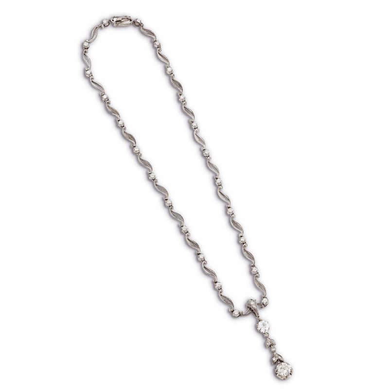 in oro bianco 18kt, impreziosito da diamanti taglio vecchio e brillante per ct 2.50 circa, chiusura a cassetta, punzone 750, lungh. cm 38 circa, gr. 22