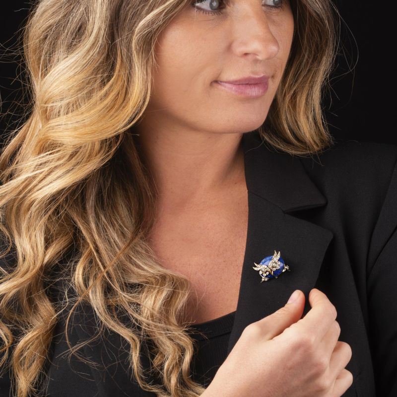 SPILLA A FORMA DI CIVETTA CON LAPISLAZZULI E DIAMANTI