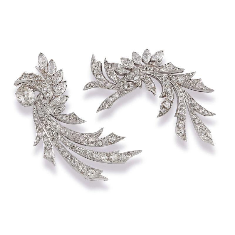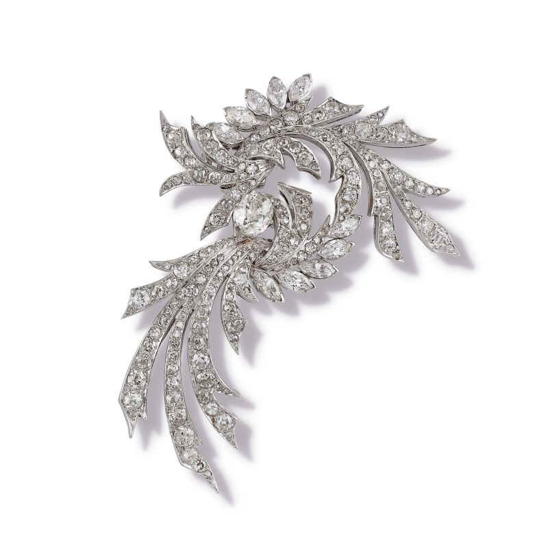 in oro bianco 18kt, impreziosita da diamanti taglio antico, huit huit e navette per ct 6.50 circa, dim. cm 4x7 circa, gr. 27