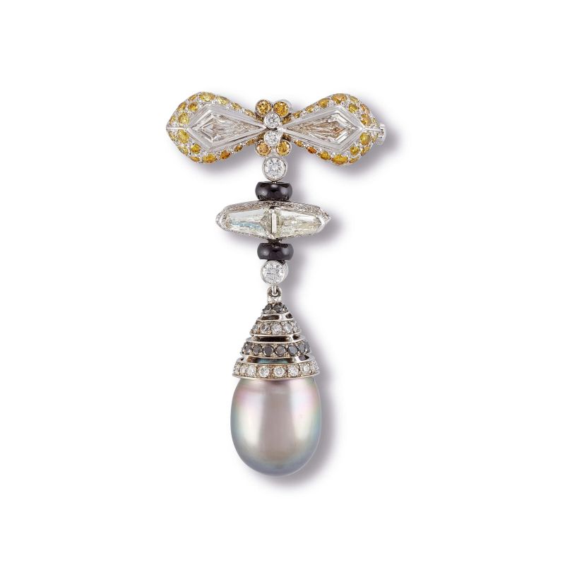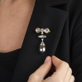 SPILLA CON DIAMANTI E PERLA PENDENTE