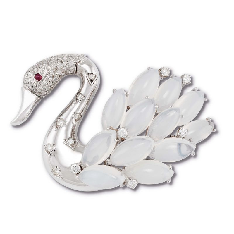 in oro bianco 18kt, a forma di cigno, impreziosito da pietre di luna taglio navette cabochon e diamanti taglio brillante e huit huit (difetti) per ct 2.20 circa, dim. cm 6x4 circa, gr. 38