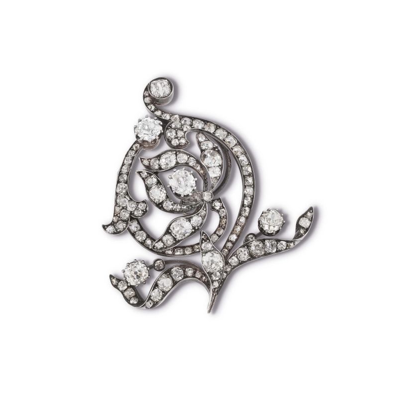 in argento e oro giallo 9kt, dalle linee sinuose, a forma di fiore, impreziosita da diamanti taglio antico per ct 10 circa, dim. cm 5x5.5 circa, gr. 22