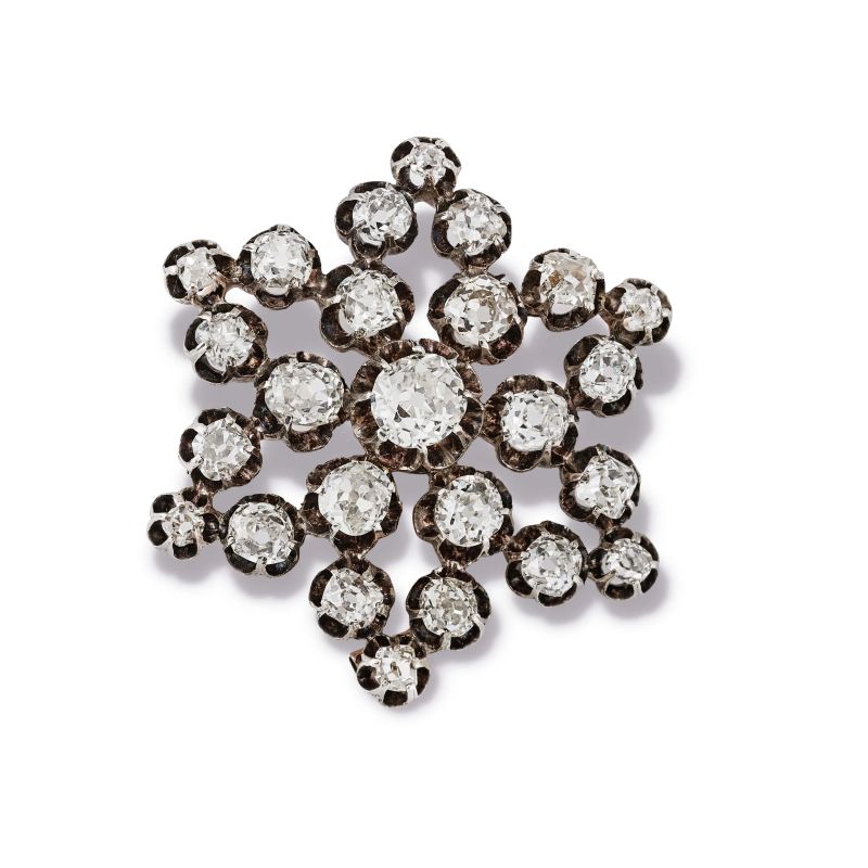 in argento e oro rosa 14kt, a forma di fiore, impreziosita da diamanti taglio antico per ct 3 circa, dim. cm 3.5x2.5, gr. 7