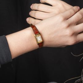 cassa di forma rettangolare con sistema a scorrimento e alloggio in oro giallo 18kt, corona con rimessa dell'ora a pulsante, quadrante argenté, grafica nera, numeri arabi stampati, movimento al quarzo, cinturino in pelle marrone con fibbia in oro giallo 18kt originali, vetro minerale, gr. 20. Dim. mm 15x28