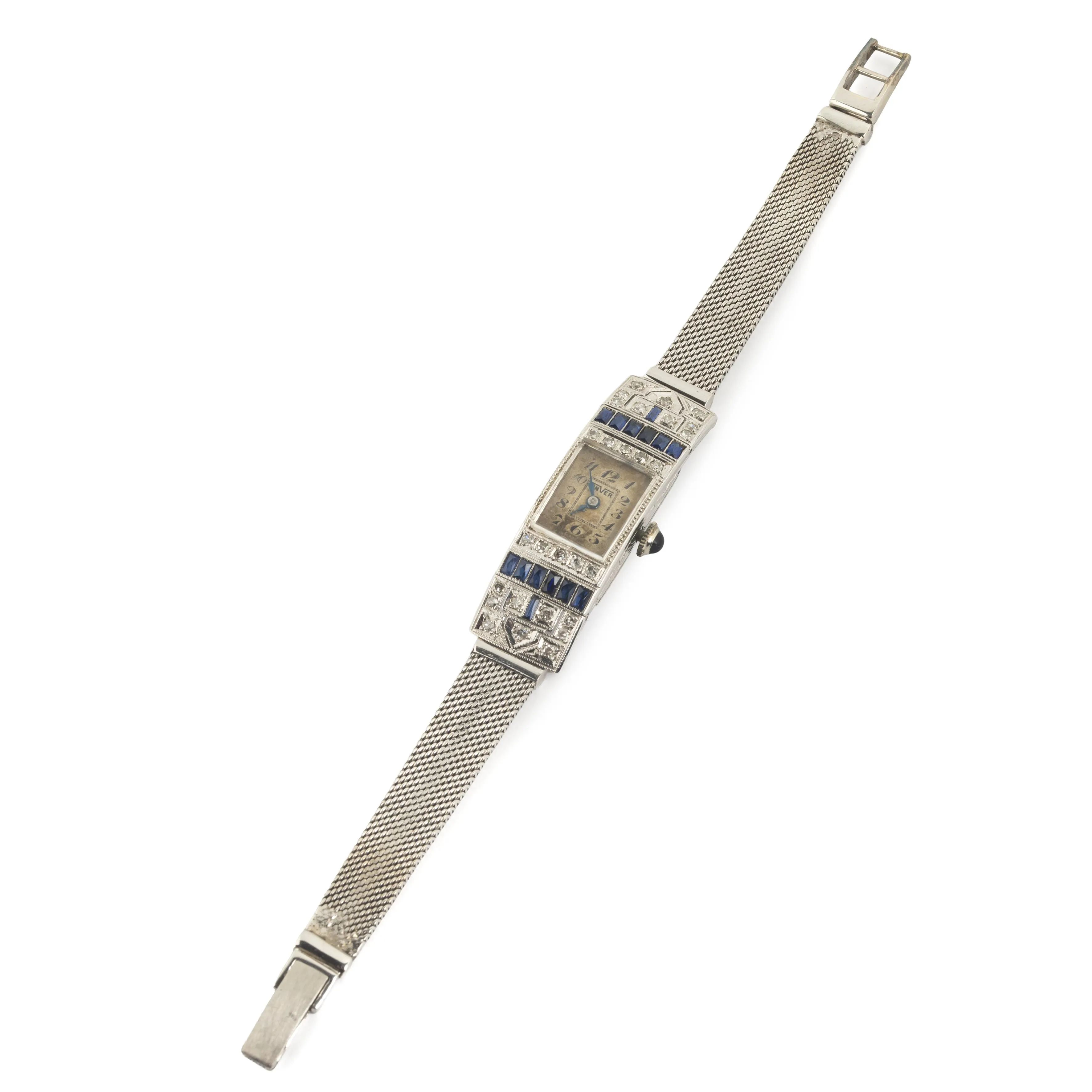 cassa di forma a cerniera in oro bianco 18kt, bordo inciso con elementi fogliacei, anse e lunetta impreziosite da diamanti e zaffiri, corona con pietra cabochon blu, quadrante argentè (difetti), numeri arabi, movimento a carica manuale, bracciale integrato a maglia tessita in oro bianco 18kt con chiusura a scomparsa, vetro minerale, gr. 21. Dim. mm 12x40