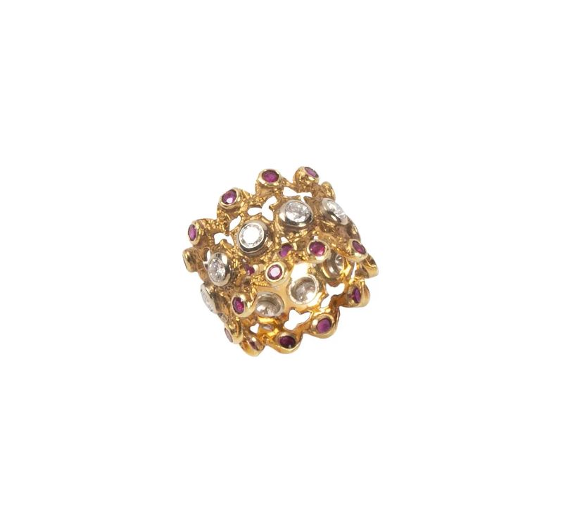 in oro 14kt, traforato, impreziosito da diamanti taglio brillante per ct 1.50 circa e rubini taglio rotondo per ct 0.60 circa, mis. 14/54, gr. 8