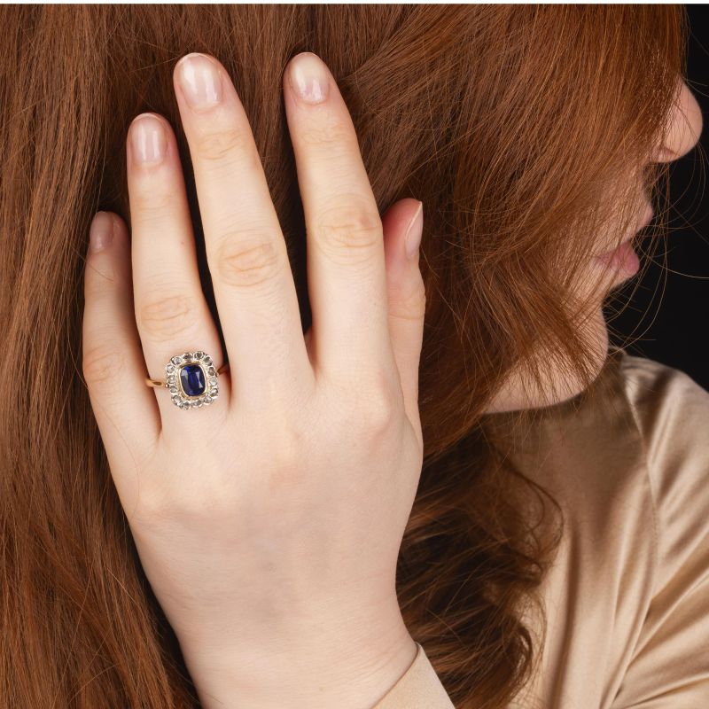 in oro giallo e bianco 18kt, impreziosito al centro da uno zaffiro sintetico, circondato da diamanti taglio a rosa per ct 0.40 circa, mis. 18/58, gr. 5