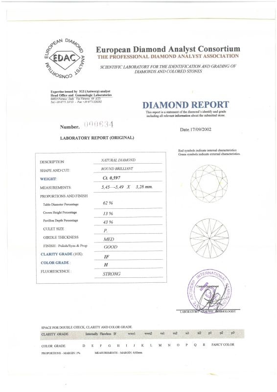 in oro bianco 18kt, impreziosito da un diamante taglio brillante di ct 0.60, colore H, purezza IF, corredato di certificato EDAC del 17/09/2002 attestante le caratteristiche della pietra, punzone 750 e del fabbricante, mis. 15/55, gr. 2