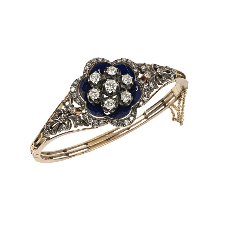 in argento e oro rosa 9kt, impreziosito al centro da diamanti taglio brillante per ct 1.50 circa (difetti), circondati da petali di fiore smaltati blu, affiancati da diamanti taglio huit huit per ct 0.40 circa, chiusura a cerniera con catenina diam. cm 6.5 circa, gr. 26