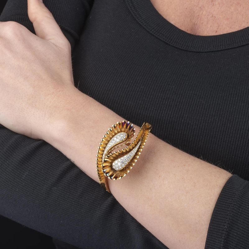 in oro giallo 18kt, impreziosito da diamanti taglio brillante per ct 1.40 circa, punzoni 750 e del fabbricante, diam. interno cm 5.5, circonferenza cm 16.5, gr. 57