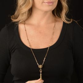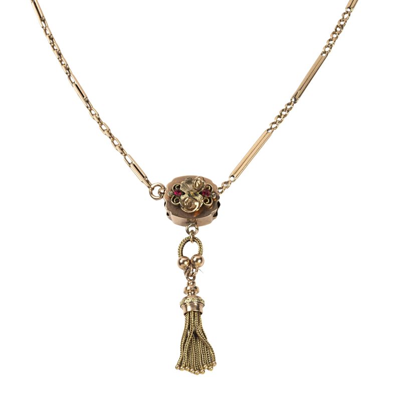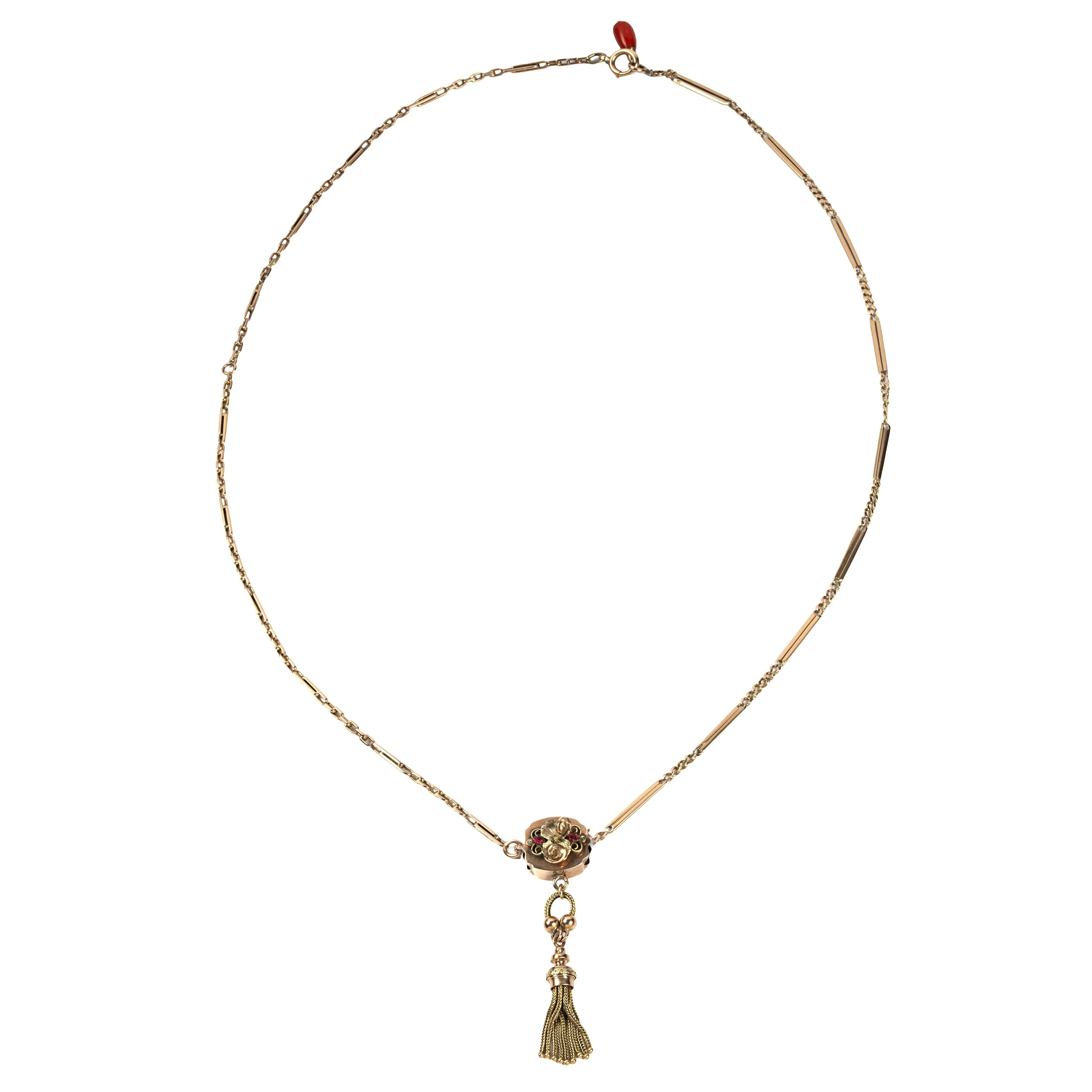 in oro giallo 14kt e rosa a basso titolo, dal quale pende un corallo a goccia e e una nappa con frange impreziosita da pietre rosse, chiusura a moschettone, lungh. cm 90 circa, gr. 36