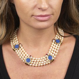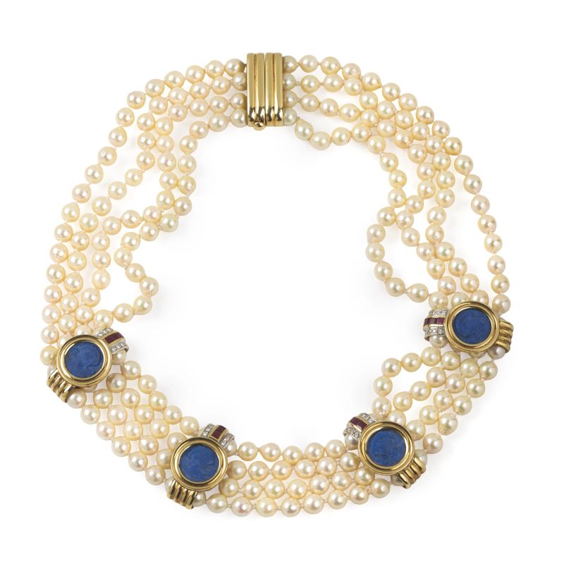 in oro giallo 18kt, composta da quattro fili di perle con distanziali in oro decorati al centro da elementi circolari raffiguranti un profilo di donna a rilievo su pasta, impreziositi da rubini taglio carrè per ct 1.20 circa, diamanti taglio brillante per ct 0.60 circa, chiusura a cassetta, lungh. cm 45 circa, gr. 170