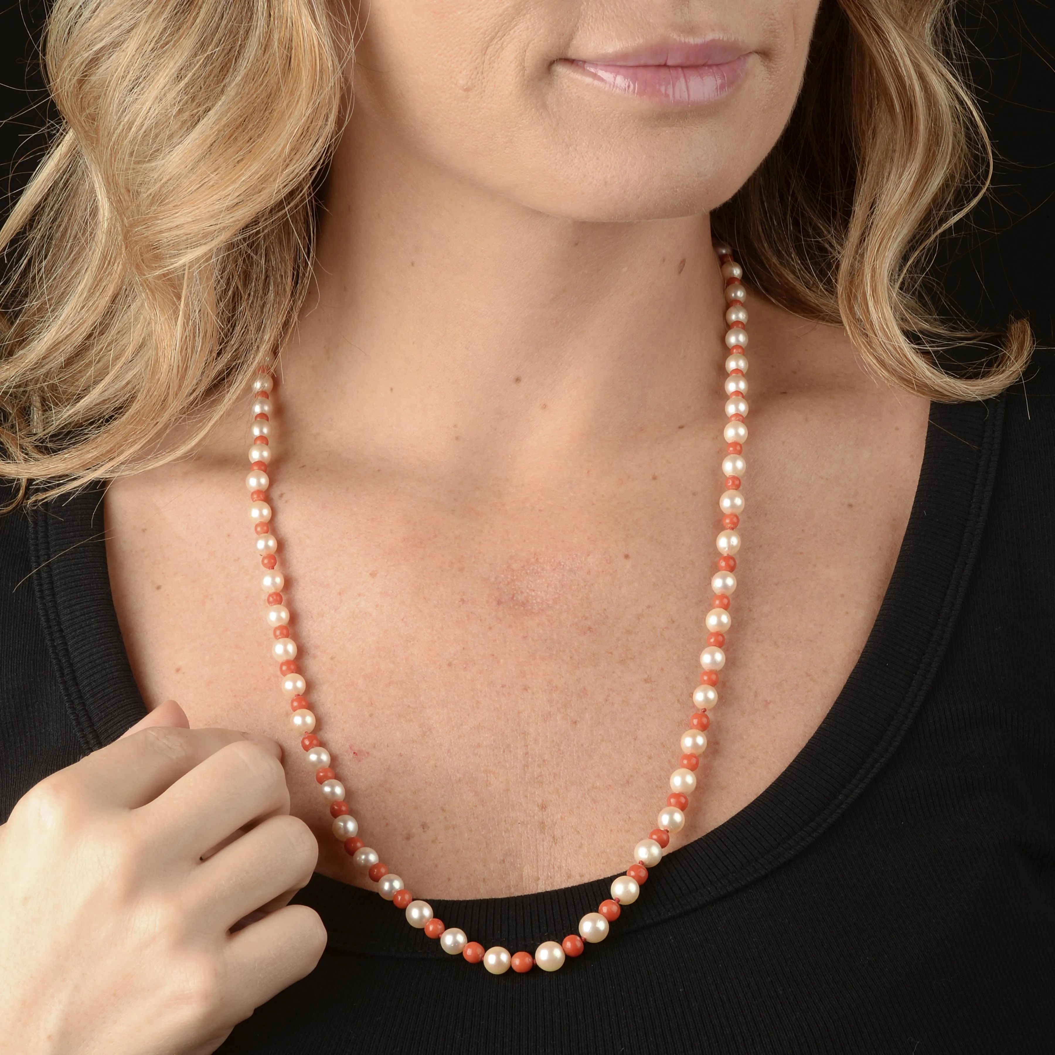 composta perle di mm 7 circa, alternate a sfere di corallo di mm 3 circa, fermatura in oro giallo e bianco 18kt, lungh. cm 64, gr. 30