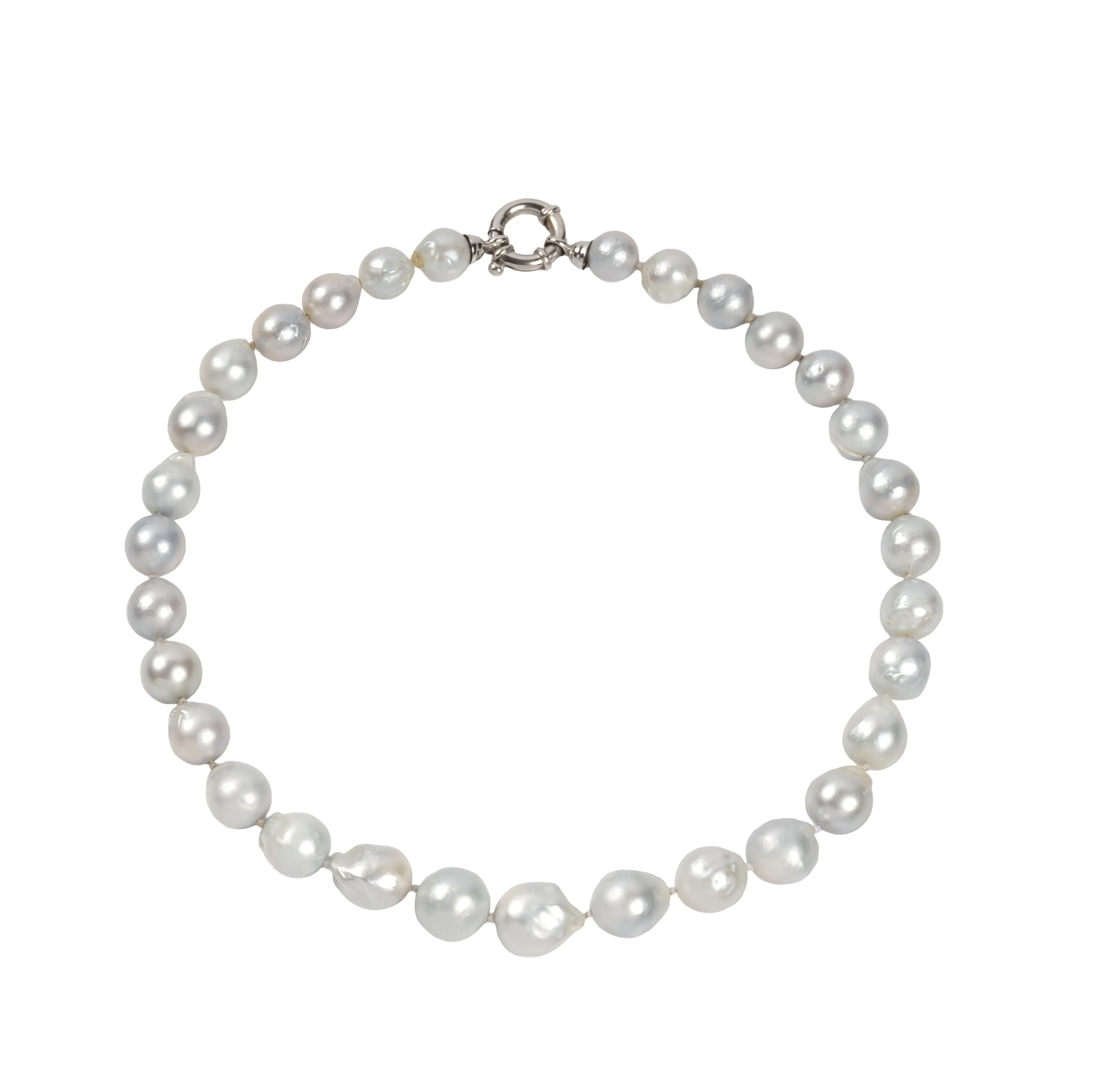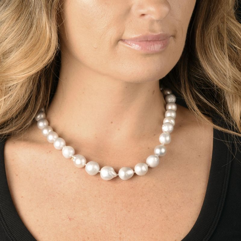 composta da perle di mm 14-11 circa, chiusura a moschettone in oro bianco 18kt, lungh. cm 46, gr. 86