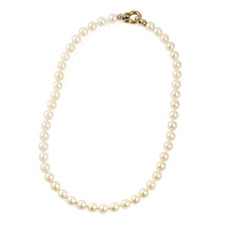 composta da un filo di perle di mm 8 circa, fermatura in oro giallo e bianco 18kt, chiusura a scomparsa, punzone 750, lungh. cm 46 circa, gr. 51