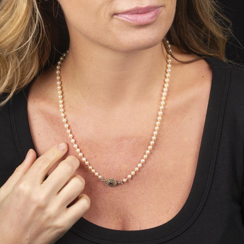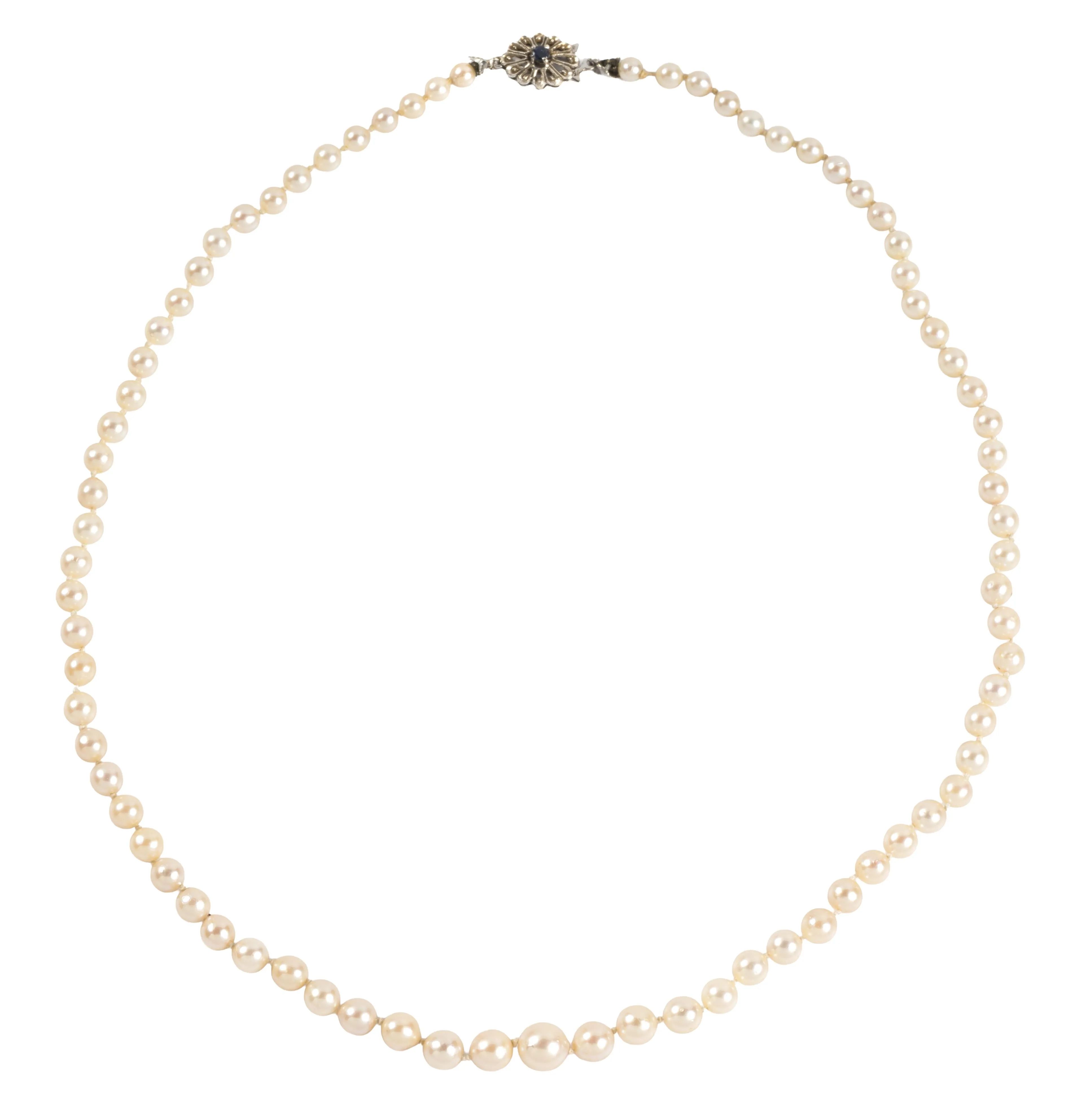 composta da una serie di perle digradanti di mm 5-4 circa, uno zaffiro taglio ovale per ct 0.10 circa (difetti), fermatura in oro bianco 18kt, punzone 750 e del fabbricante, lungh. cm 50 circa, gr. 19