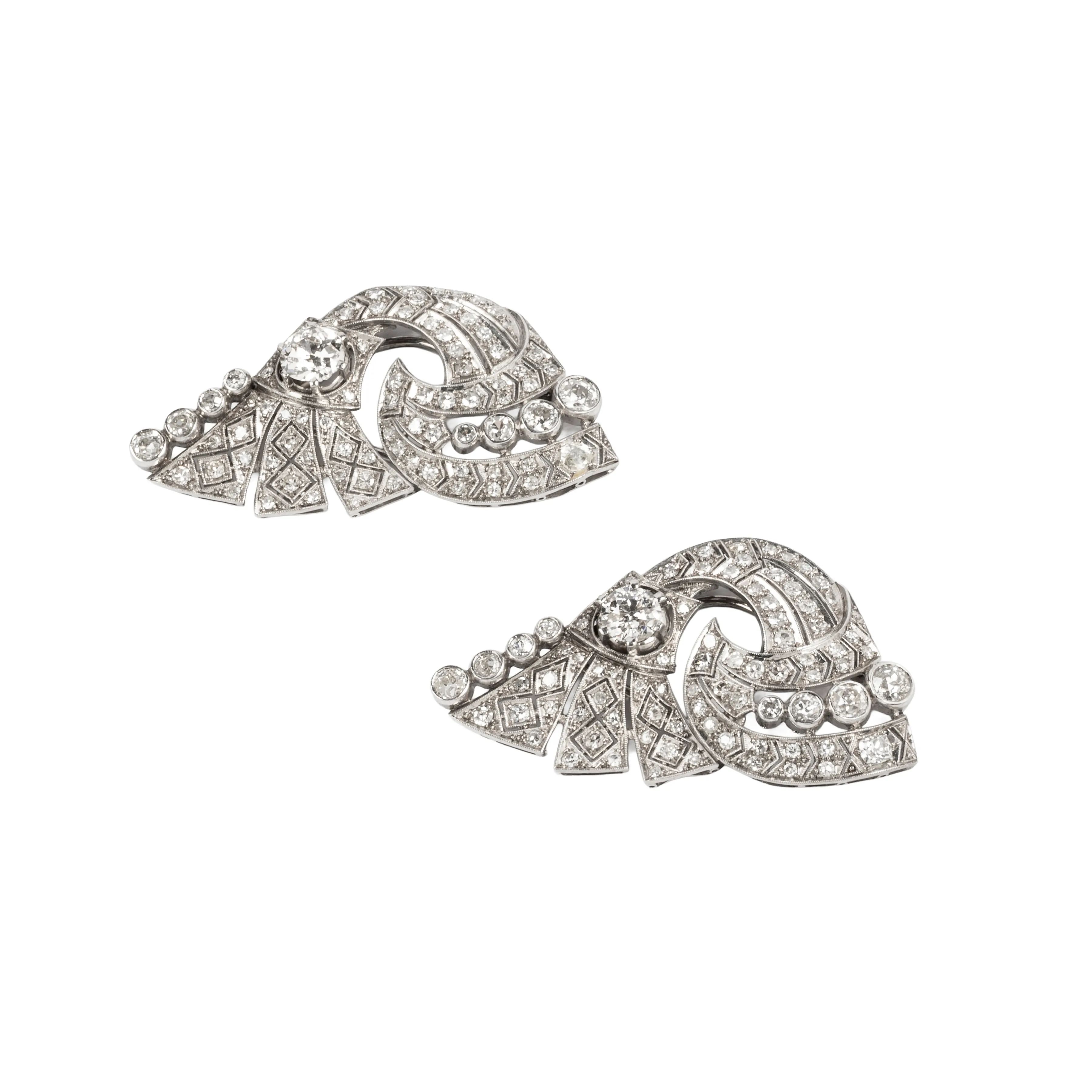 in oro bianco 18kt, impreziosite da diamanti taglio antico e huit huit per ct. 7 circa, chiusura a clip, dim. cm 5x3, gr. 27