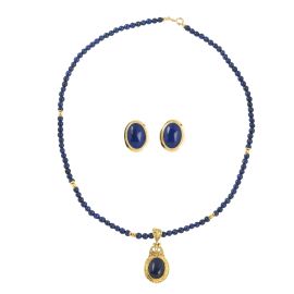 formata da un collier composto da una serie di sfere in lapislazzuli di mm 4 circa, alternate a sfere in oro giallo di mm 3 circa dal quale pende un lapislazzulo taglio ovale, circondato da un motivo in oro giallo 18kt intrecciato, chiusura a moschettone, punzone 750 e del fabbricante, lungh. cm 45 circa, gr. 16, e orecchini con lapislazzuli taglio ovale, in oro giallo 18kt, chiusura a clip con perno, punzone 750 e del fabbricante, dim. cm 2x2 circa, gr. 12