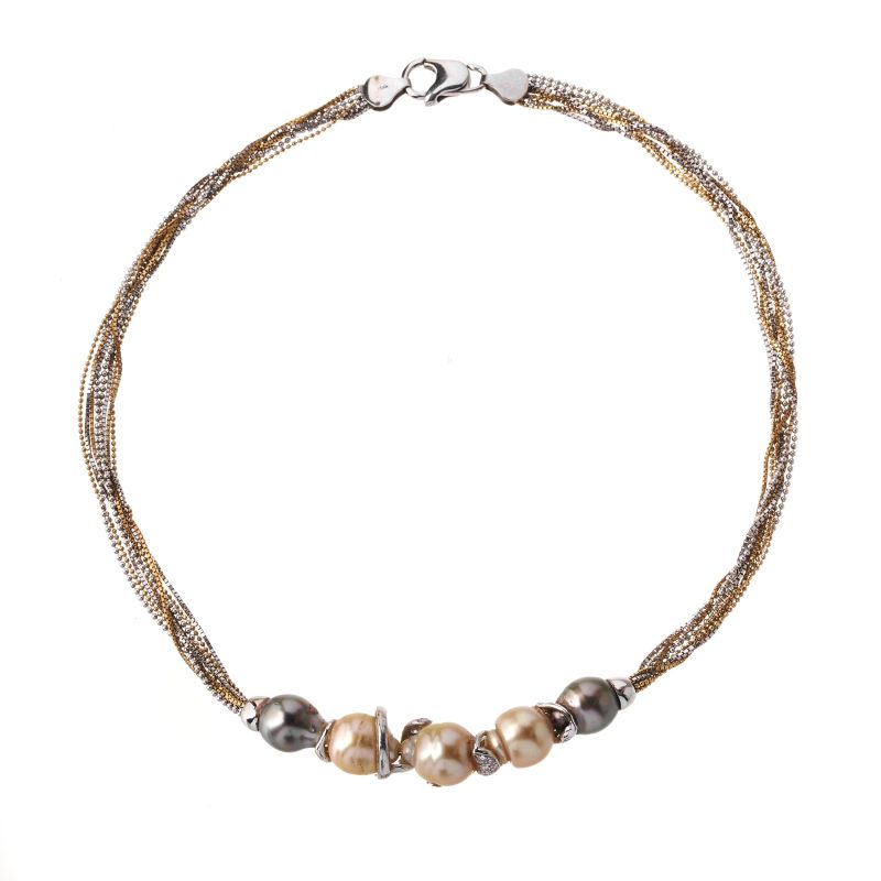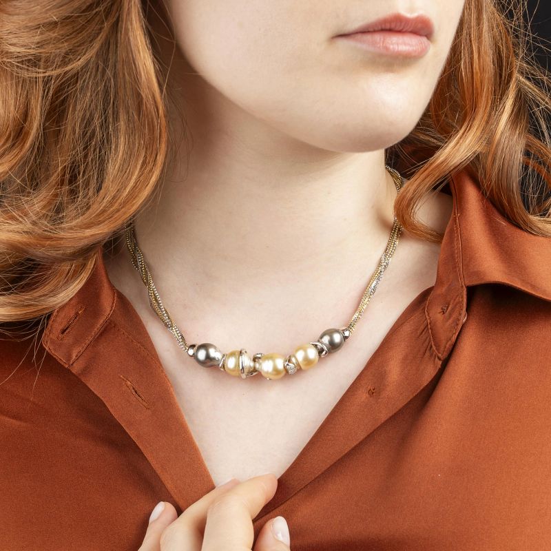 in oro giallo e bianco 18kt, realizzato a più fili intrecciati con parte centrale impreziosita da perle grigie e bianche di mm 11 circa, diamanti taglio brillante per ct 0.50 circa, chiusura a moschettone, punzone 750, lungh. cm 41, gr. 35