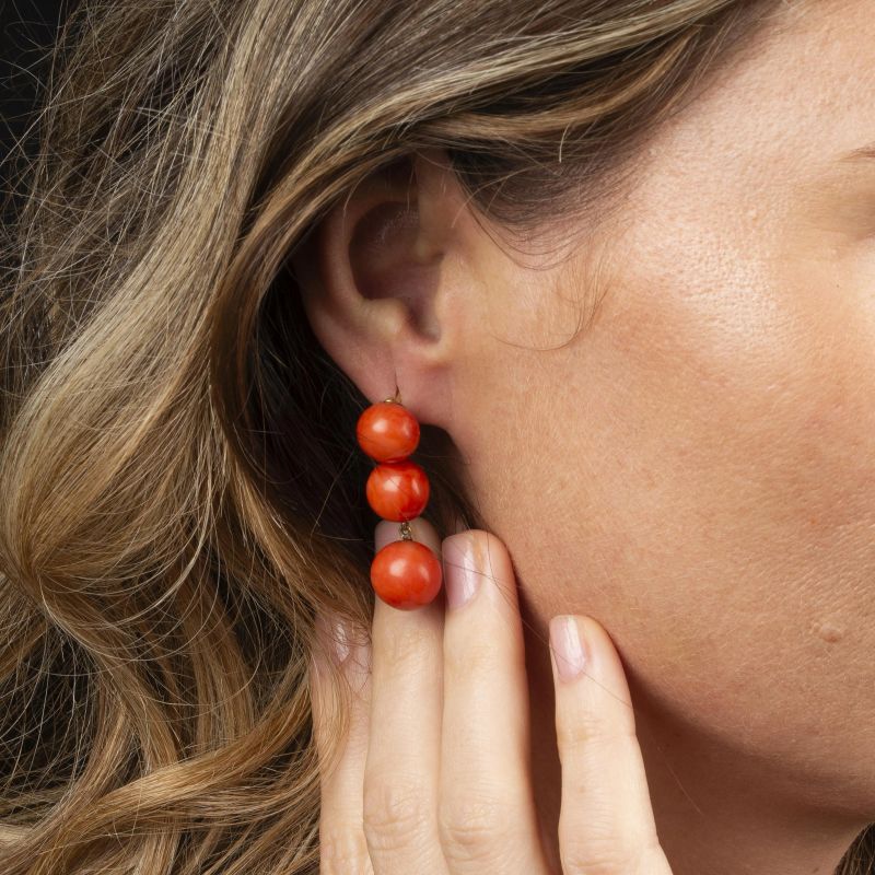 in oro giallo 18kt, impreziositi con sfere di corallo di mm 11 circa, chiusura a farfallina (difetti), punzone 750, lungh. cm 4 circa, gr. 13