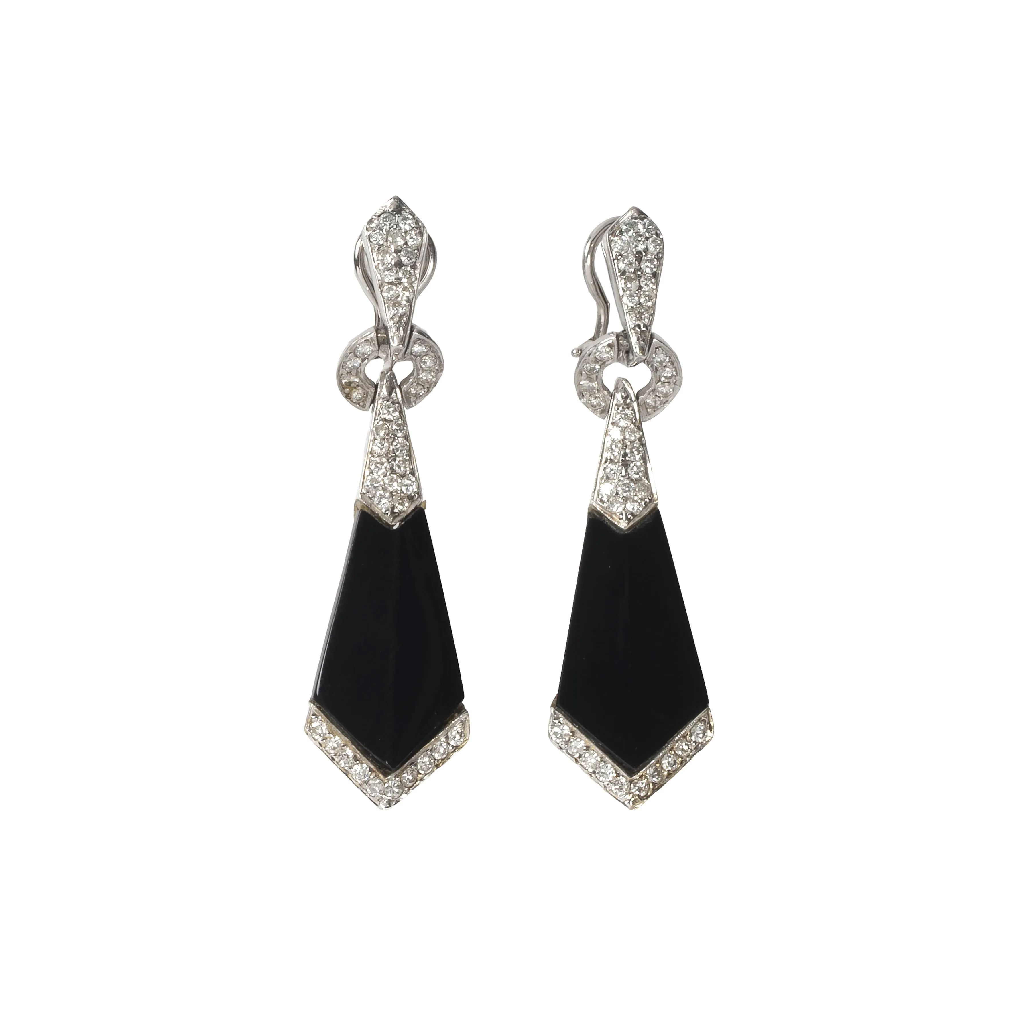 in oro bianco 18kt, impreziositi da elementi decorativi in onice e diamanti taglio brillante per ct 1 circa, chiusura a clip con perno, dim. cm 1.7x6, gr. 23