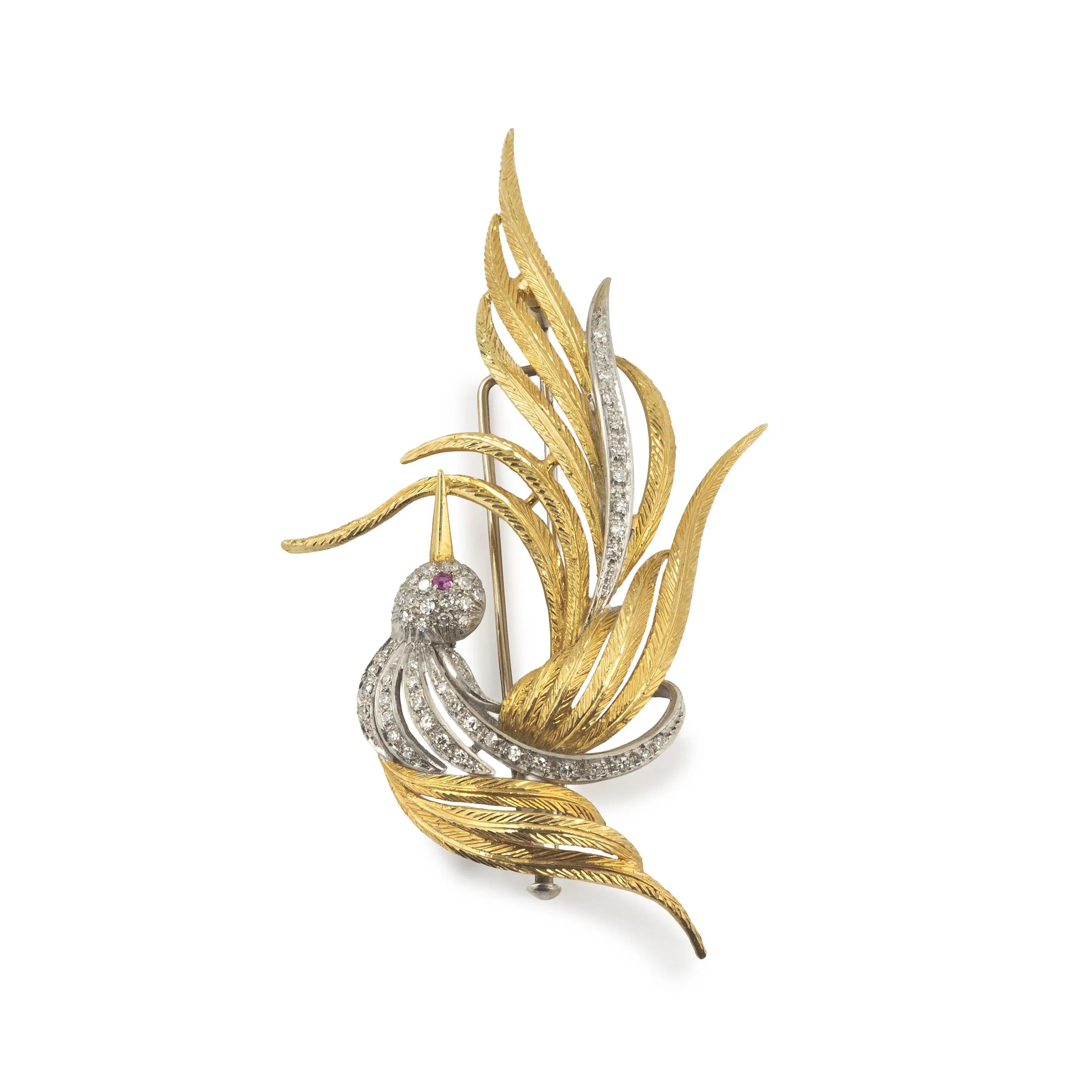 in oro giallo e bianco 18kt, a forma di uccello del paradiso, impreziosita da pavè di diamanti taglio huit huit per ct 0.30 circa e un piccolo rubino taglio rotondo, con finitura replicante la texture delle piume, punzone 750 e del fabbricante, dim. cm 7x3.5 circa, gr. 15