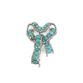 in oro bianco 18kt, a forma di nastro annodato, impreziosita da turchesi e diamanti taglio brillante (difetti) per ct 2.50 circa, dim. cm 6x4 circa, gr. 25