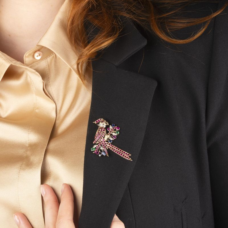 in oro giallo 14kt, a forma di pappagallo, impreziosita da rubini taglio rotondo per ct 2.40 circa, diamanti taglio brillante per ct 0.20 circa e pietre di colore, dim. cm 3x4 circa, gr. 9