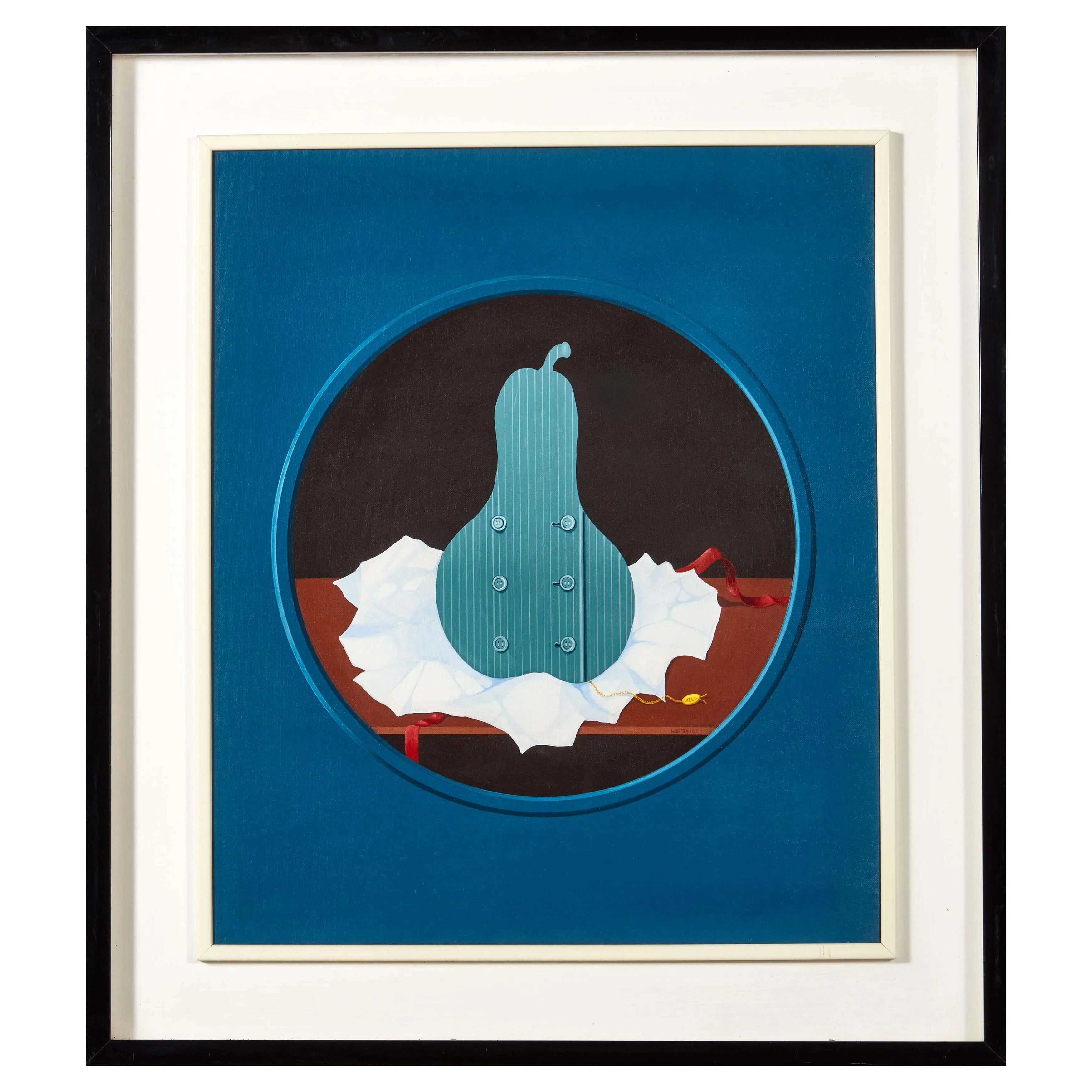 Una pera vestita da Yves Saint-Laurenttecnica mista su telacm 65x54firmato in basso a destraal retro firmato e titolatoal retro timbro Galleria Schreiber, Brescia