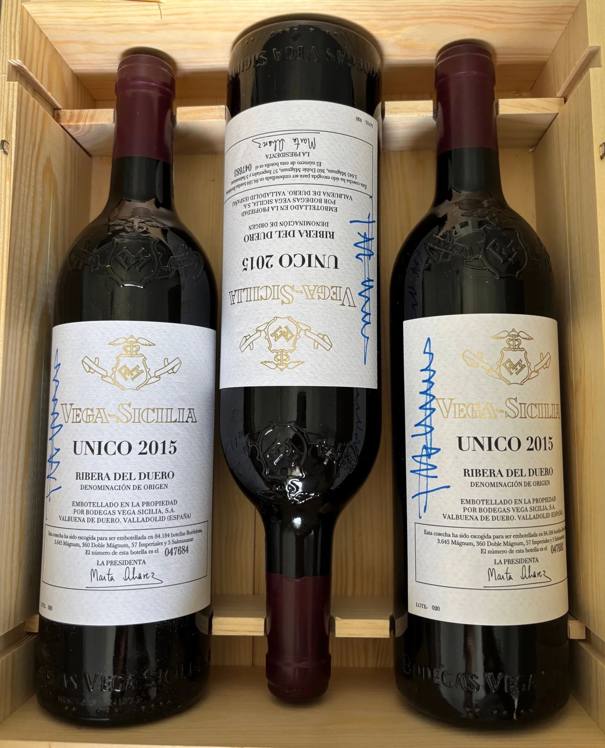 1 Confezione da 3 bottiglie (75cl) di Vega Sicilia, Unico 2015 ciascuna delle quali autogtafate dal titolare Pablo Alvarez