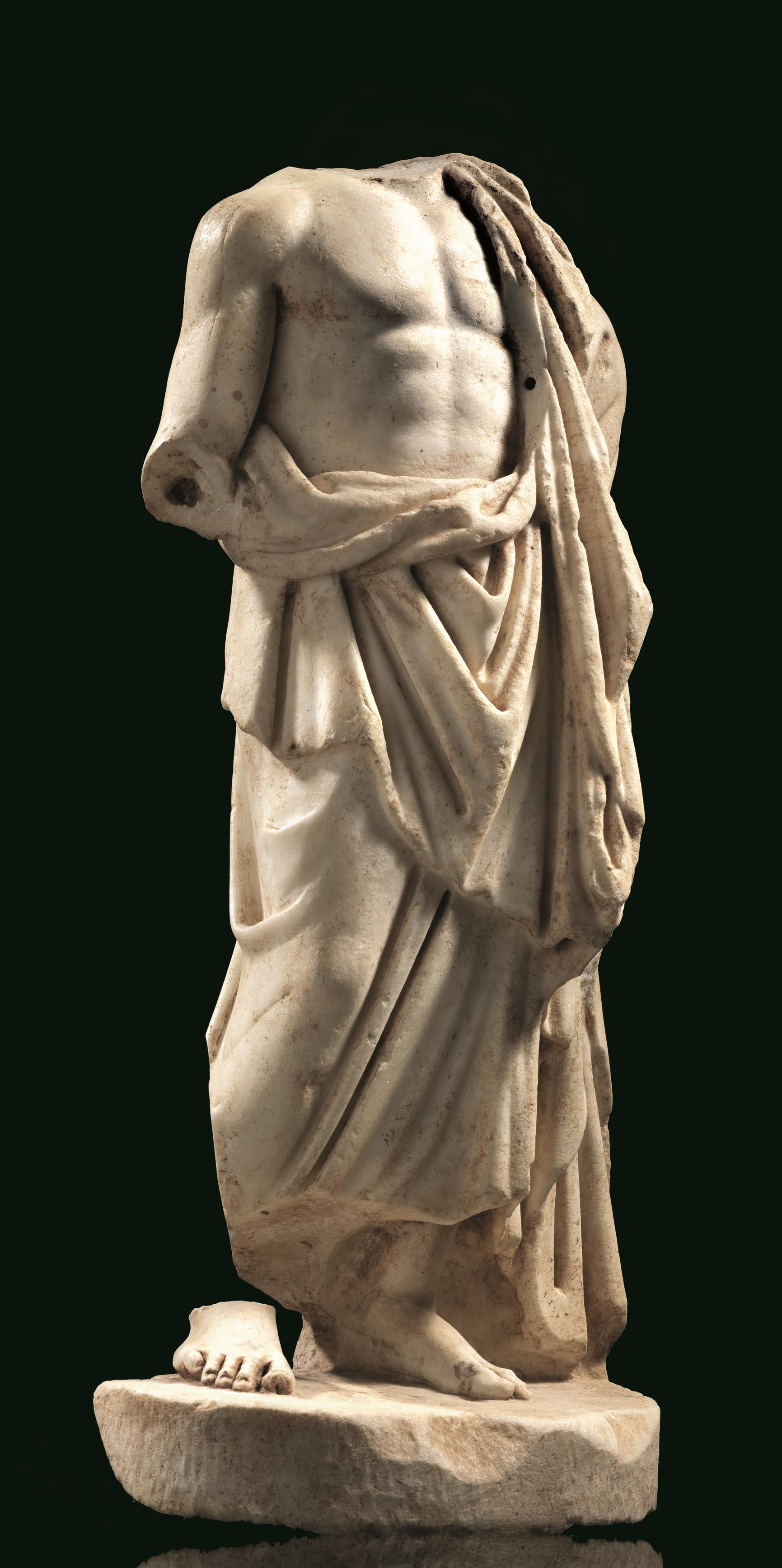 In marmo greco insulare a grandi cristalli è invece un torso di Afrodite, opera riferibile a maestranze romane del I-II secolo d.C. che lavoravano ancora nella tradizione formale ellenistica: è in catalogo con la stima di 20.000/30.000 euro. Poi una figura acefala del dio medico Asclepio, paludato con un manto dal plastico panneggio, scolpita in marmo bianco nel corso del II secolo d.C., per la quale sono richiesti 20.000/30.000 euro.