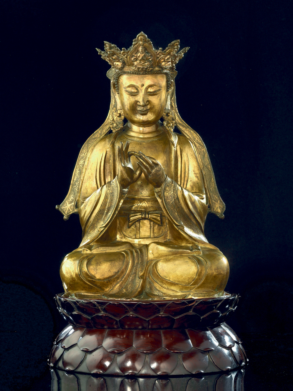 Il Vairocana è una scultura di 52 centimetri in bronzo dorato con caratteristiche d’inconsueta rarità perché raffigura il Buddha seduto, una delle sue posture più consuete, ma con un mudra – posizione delle mani – raramente riscontrato in opere di tale grandezza e importanza: entrambe hanno pollice e indice uniti a formare dei cerchi e le altre dita tese con il palmo sinistro rivolto al petto e quello destro all’esterno.