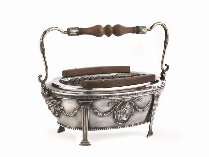 Quindi, per l’argenteria italiana oltra a quella sacra, va sottolineata la nutrita presenza in catalogo di manufatti romani; tra questi una bella LUCERNA dell’argentiere Roberto Tombesi, databile con ogni probabilità al 1815 e riconducibile al mondo ecclesiastico in virtù dello stemma cardinalizio che campeggia a rilievo sulla ventola, la cui richiesta è di 6.000/8.000 euro. Nella selezione di opere romane troviamo anche uno SCALDINO ovale del 1795 decorato in stile neoclassico con quattro sostegni a lesene scanalate e festoni che reggono medaglioni dai contorni perlinati che racchiudono profili classici, stimato 3.000/4.000 euro. Ancora, una CAFFETTIERA, realizzata dall’argentiere romano Lorenzo Petroncelli nel 1770 circa, che ha base circolare e corpo piriforme scanalato a spirale, il manico è in legno e il coperchio è ornato da un bocciolo, la richiesta è di 1.200/2.000 euro.