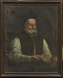 sul retro della tela cartiglio con lunga iscrizione a penna che ricorda i fatti della vita dell'effigiato morto nel 1621; sul retro del telaio iscritto "Salone Terreno n. 7"