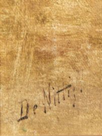 Dal 1863 al 1865, la sensibilità del grande maestro pugliese, già espressa nei suoi primi saggi pittorici, nei paesaggi già pervasi da un promettente e schietto senso naturalistico, lo porta a quell'esperienza di pittura en-plein air che metterà a punto insieme con Federico Rossano, Marco De Gregorio, Raffaele Belliazzi e altri e che prende forma in quel gruppo di liberi pittori di scene della natura che Domenico Morelli chiamava la "Repubblica di Portici". Nelle opere di questo periodo De Nittis è orientato verso lo studio dal vero, l'immediatezza dell'impressione che lo porta ad eseguire una serie di paesaggi immersi in una luce limpida e tersa. Ma è senz'altro il 1867 l'anno il più importante per De Nittis poiché in quell'anno varca i confini delle uniche regioni che conosce bene sino ad allora, Puglie e Campania, per recarsi a Roma, dove si trattiene per un mese e dove porta ad un'esposizione non identificata i quadri che poi sarebbero successivamente esposti a Firenze ma di cui non si hanno notizie e documenti. Sempre nello stesso anno si reca a Parigi, dove è sedotto dalla pittura meticolosa del Meissonier e conosce i mercanti parigini Frederic Reutlinger ed Adolphe Goupil, che colgono subito le qualità del giovine pittore. De Nittis si trattiene a Parigi ma a causa della guerra franco-prussiana rientra in patria a Portici, dove per quasi due anni dipinge ai piedi del Vesuvio, anche se già nel 1872 rientra a Parigi con la famiglia e lì si stabilisce definitivamente. Individuiamo gli anni dal 1868 al 1871 come datazione per l'esecuzione del dipinto inedito che presentiamo in questa vendita, collocabile nel periodo di formazione italiana per la fermezza compositiva, la pienezza della luce, anche se, per certe eleganze compositive, si evidenzia la conoscenza della pittura francese contemporanea con cui il De Nittis viene fugacemente in contatto nel suo primo soggiorno parigino. E più precisamente è tra il 1869-1871, al suo rientro a Portici, che si colloca stilisticamente l’esecuzione del dipinto Conversazione in giardino.