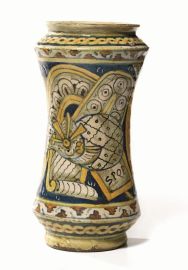in maiolica, di forma rastremata, decorato con un pigmento ricco e spessa