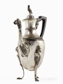 corpo piriforme, finale del coperchio modellato a pappagallo, tre piedini terminanti a zampa ferina, manico danneggiato in legno ebanizzato, alt. 35,5, g 1120