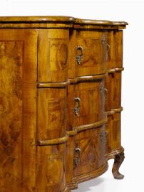 in noce e radica di noce, piano sagomato con becco di civetta, fronte e fianchi mossi, tre cassetti, piedi a voluta, cm 88x135x64