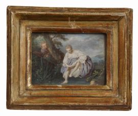 dipinte su avorio con scene galanti, entro cornici in legno dorato, cm 10,8x13,2 (complessivamente)